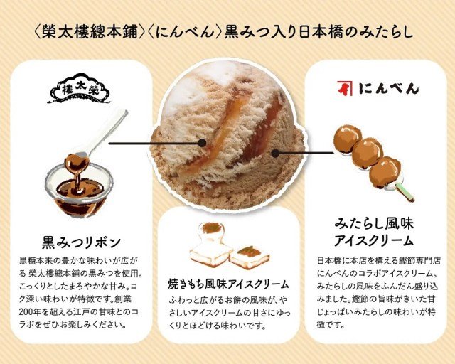 As the name implies, the new flavor makes use of kuromitsu, a molasses-like thick brown sugar syrup that’s a mouthwatering seasoning in many traditional Japanese desserts. Not just any kuromitsu will do for this special treat, though, and so Baskin-Robbins is sourcing its kuromitsu from Eitaro, a confectioner that’s been operating its shop in Nihonbashi for over 200 years. Also lending a hand is Ninben, another Nihonbashi foodstuffs store which was started in 1699 and is supplying the flavor of mitarashi, the old-school dumpling glaze in Japan that’s both sweet and savory. These ingredients are mixed into an ice cream base with the flavor of roasted mochi for a sophisticated yet classically comforting combination of taste sensations.