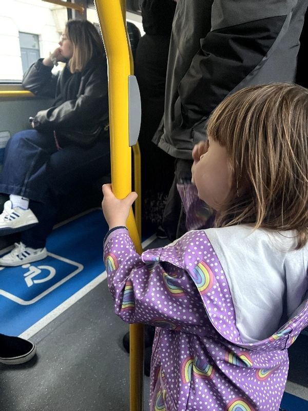 Then author’s daughter on a bus in Dublin. (Photo courtesy of Kelly LawleR)It is not surprising that Americans culturally reject children in public, because we are a society based on the myth of “rugged individualism” and capitalist hegemony: If it’s not for you, it is against you. If they’re not your kid, then they’re in your way.